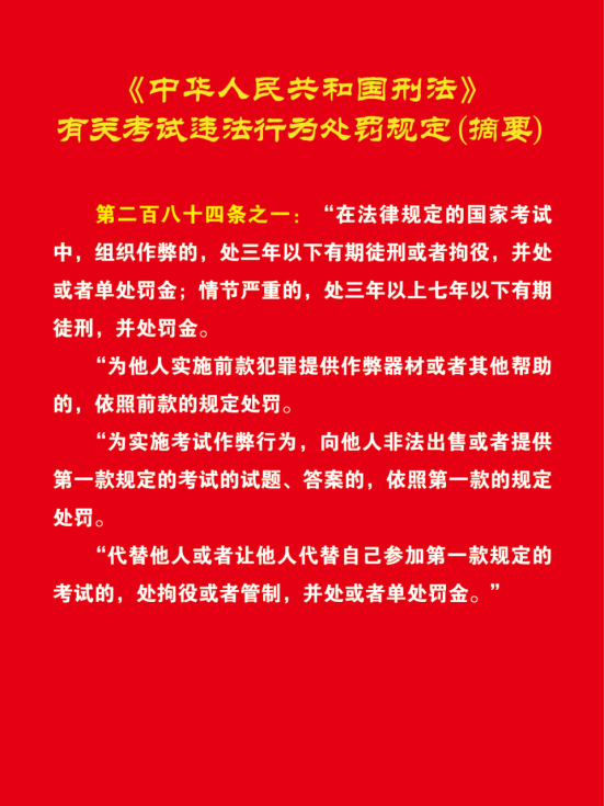 7.请各位考生考前认真阅读《考试注意事项》、《考场规则》、《国家教育考试违规处理办法(摘要)》、《刑法修正案(九)》有关考试违法行为处罚规定。考生应自觉遵守考场规则,主动配合考务人员工作。不遵守考场规则,不服从考务工作人员管理,有违纪、作弊等行为的,将按照《国家教育考试违规处理办法》等有关规定进行处理,处理结果将通报作弊考生所在单位,并记入国家教育考试考生诚信档案。